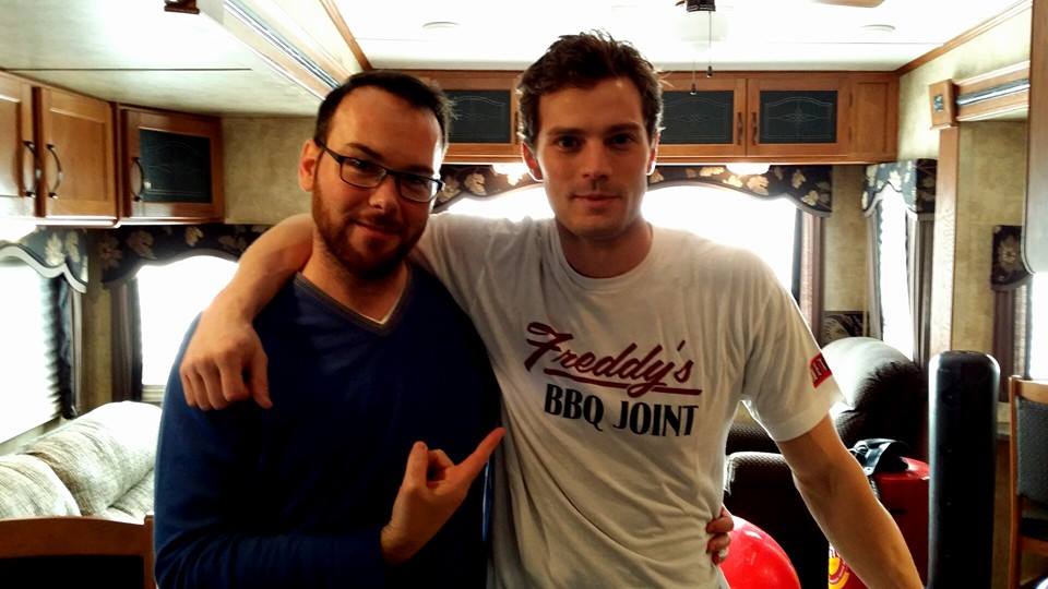Na última semana das filmagens de Cinquenta Tons de Cinza, o produtor do longa-metragem Dana Brunetti postou uma foto em sua conta no Facebook posando ao lado de… Jamie Dornan… Nada mais, nada menos do que o Christian Grey da ficção. “Christian Grey come no Freddy’s BBQ (churrasco, em inglês)”, escreveu Brunetti. Dornan também estava usando uma camiseta do tal Freddy’s.
